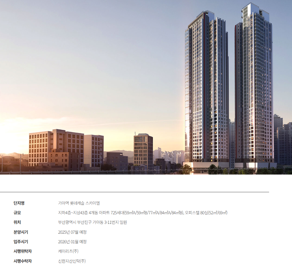 가야역 인근 단지들의 전용 84㎡ 기준 실거래가는 약 5억~6억5천만 원 수준이며, 서면 생활권에 속한 브랜드 단지일수록 시세 프리미엄이 높은 편입니다. ‘가야역 롯데캐슬 스카이엘’은 입지와 브랜드, 상품성을 모두 갖춘 신축 단지로서 향후 시세 상승 여지가 매우 높은 곳으로 평가됩니다.