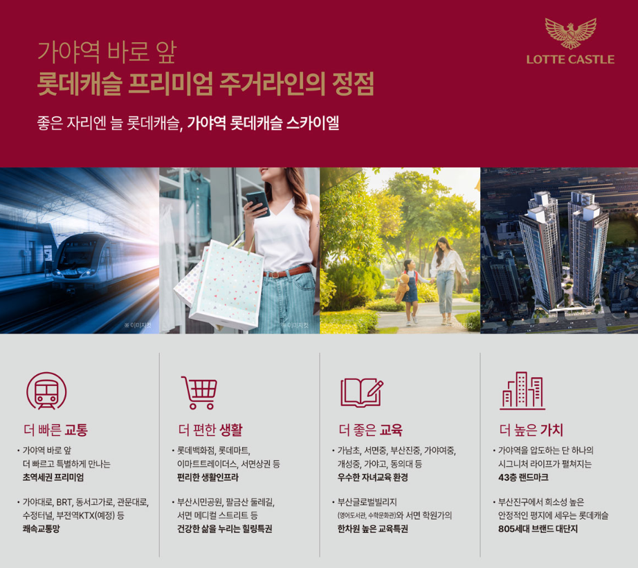 ‘가야역 롯데캐슬 스카이엘’은 부산진구 가야동 367-17번지 일원에 조성되는 재개발 정비사업 단지로, 지하 5층~지상 최고 38층, 총 10개 동, 1,144세대로 구성됩니다. 전용면적은 59㎡, 74㎡, 84㎡ 중심이며, 일반분양은 총 589세대입니다. 롯데건설이 시공하는 프리미엄 브랜드 아파트로, 우수한 품질과 완성도를 갖춘 주거단지입니다.