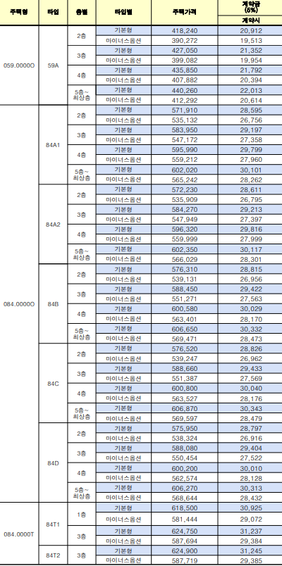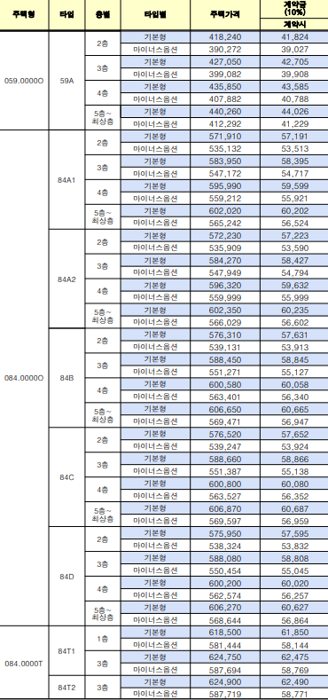- 59㎡형 기준(기본형): 약 4억 1천만 원 ~ 4억 4천만 원