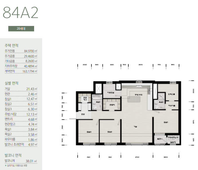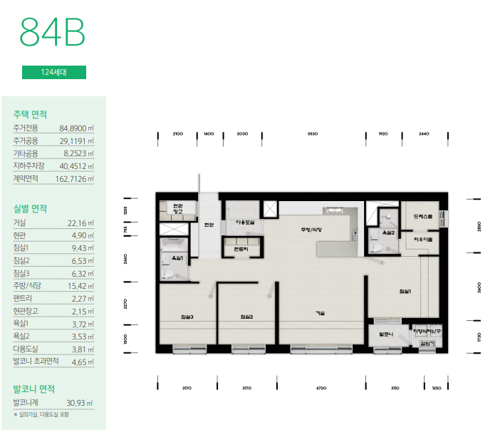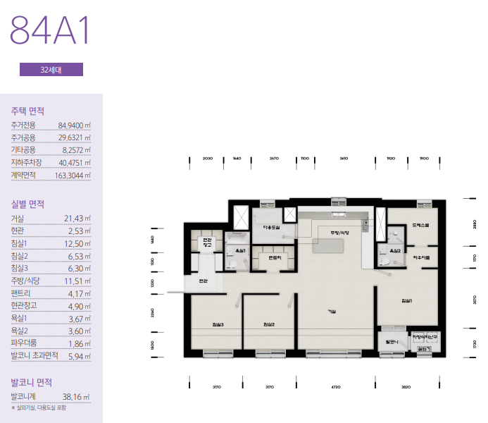 모든 세대가 발코니 확장형으로 시공되며, 타입별 세부 면적 및 옵션 사항은 주택전시관과 사이버 견본주택을 통해 미리 확인할 수 있습니다.