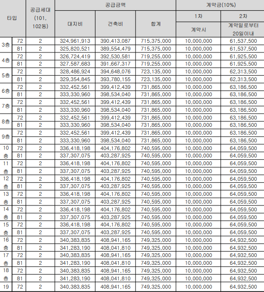 최저가 72㎡ 타입의 7억1천5백만 원부터 최고가 81㎡타입의 7억4천9백만 원까지 형성되어 있습니다. 계약금은 10%이며 1차,2차로 나눠서 납부합니다. 1차 계약금 1천만원, 20일 이내 2차 계약금 분양가의10%-1천만원 납부예정입니다.