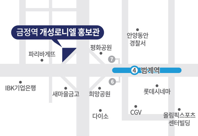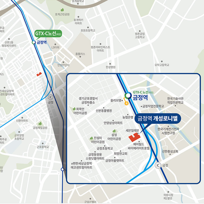 금정역 개성로니엘은 경기도 군포시 금정동에 위치하며 1,4호선, GTX-C(예정)의 철도망을 갖추고 있습니다. AK플라자, 이마트 트레이더스 등의 편의시설과 인접해있으며 금정 복합환승센터 등 금정역 일대 재개발 예정으로 쾌적한 주거 환경의 거주공간이라고 할 수 있습니다.