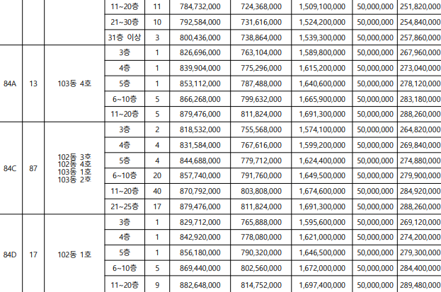 - 84㎡ (A/C/D): 약 15억 8,980만원 ~ 16억 9,740만원