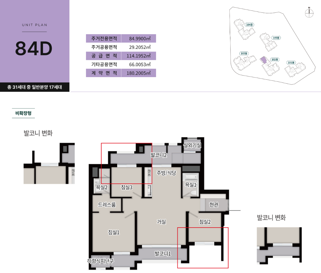 리버센트 푸르지오 위브는 효율적인 동 배치와 남향 위주 평면 설계로 채광과 통풍을 극대화했습니다. 59~84㎡로 구성되어 있으며, 3Bay 및 4Bay 위주의 실용적인 구조를 채택하고 있습니다.