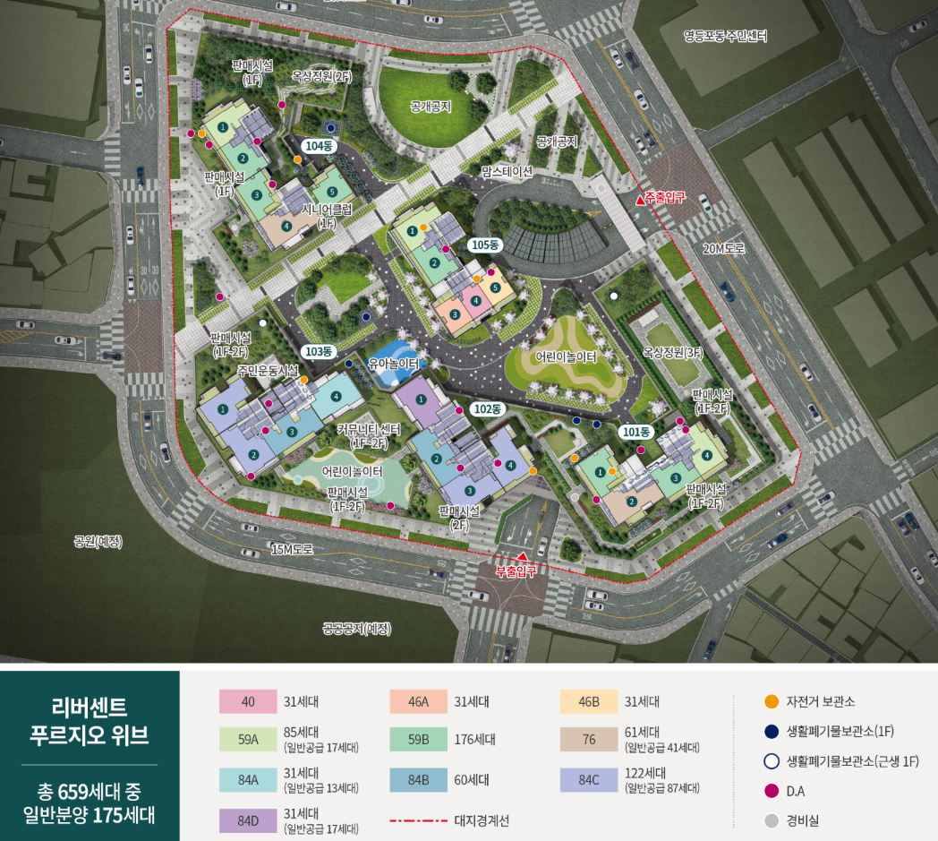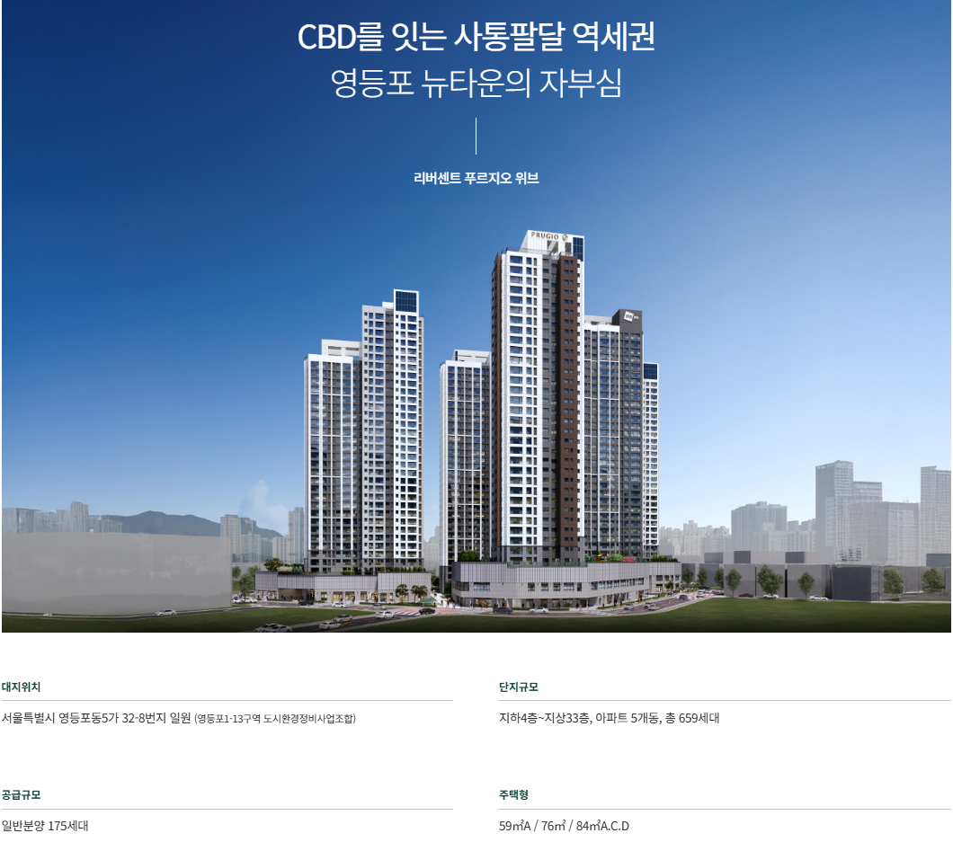- 규모: 지하 4층 ~ 지상 33층, 총 5개동, 총 659세대