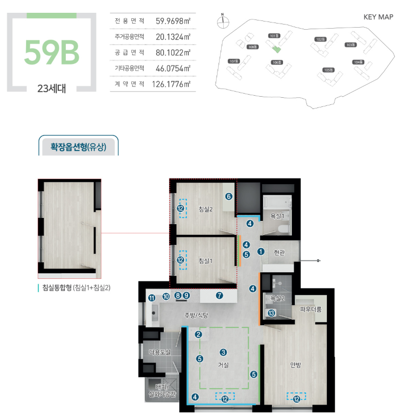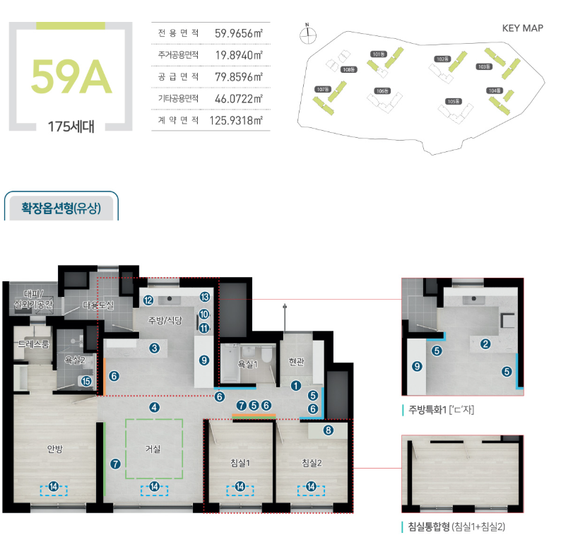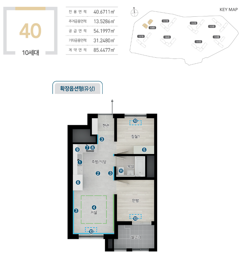 전용면적은 40㎡, 59A㎡, 59B㎡로 구성되어 있으며, 실수요자가 선호하는 중소형 평면 중심입니다. 특히 59A㎡ 타입은 가장 많은 175세대로 배정되어 있으며, 가족 구성원에 따라 다양한 평형 선택이 가능합니다. 공간 효율성과 동선 최적화를 고려한 구조가 적용되었습니다.