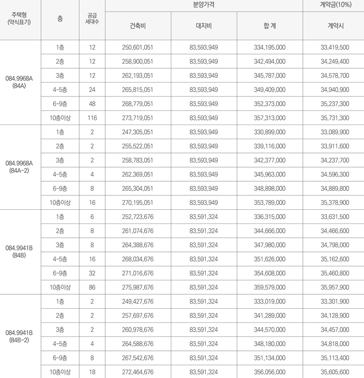 총 340세대 전부 일반분양으로 공급되며, 공급 타입은 아래와 같습니다.