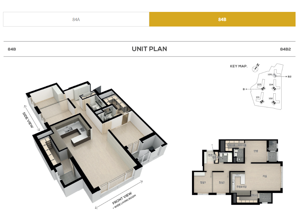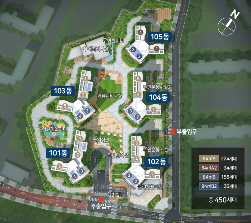 단지는 남향 위주 배치로 전 세대 채광이 우수하며, 넓은 동간 거리와 공원형 설계가 적용되어 쾌적한 생활환경을 제공합니다. 84㎡A/B/C 타입 모두 4베이, 3룸 구성에 팬트리, 드레스룸, 확장형 주방 등 실속 있는 공간 설계가 특징입니다. 세대별 평면도 및 단지배치도는 공식 홈페이지 바로가기 에서 확인 가능합니다.