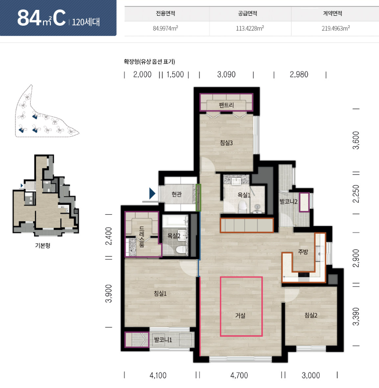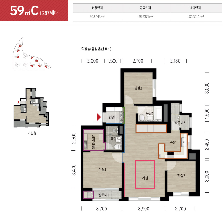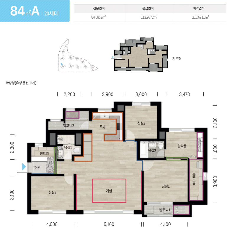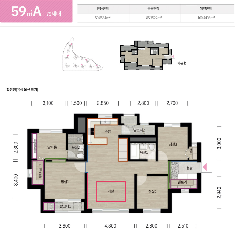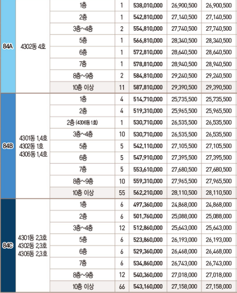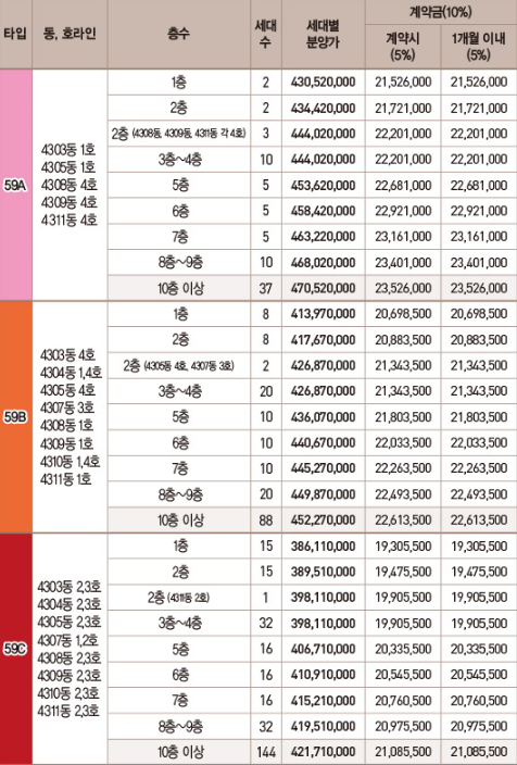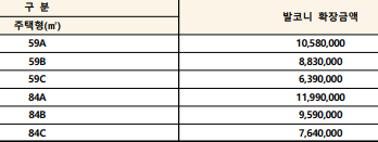 최저가 59㎡ 타입의 3억8천6백만 원 부터 최고가 84㎡타입의 5억8천7백만 원 까지 형성되어 있습니다. 발코니 확장비는 타입별 6,390,000원부터 11,990,000원까지 상이합니다. 계약금은 10%이며 1차,2차로 나눠서 납부합니다. 1차 계약금 5% 납부, 1개월 이내에 2차 계약금 나머지 5% 납부예정입니다.