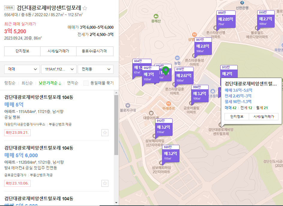 2022년 2월에 입주하였으며, 총 6개 동 556세대의 대단지입니다. 전용면적 61㎡부터 84㎡로 구성되어있습니다. 현재 매물은 84㎡ 타입 기준으로 5억 부터 5억6천 까지 다양합니다. 최근 실거래가는 23년 8월 기준 84㎡ 타입 4억 5백만원입니다.