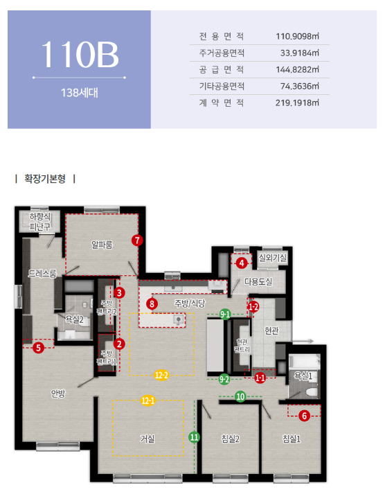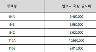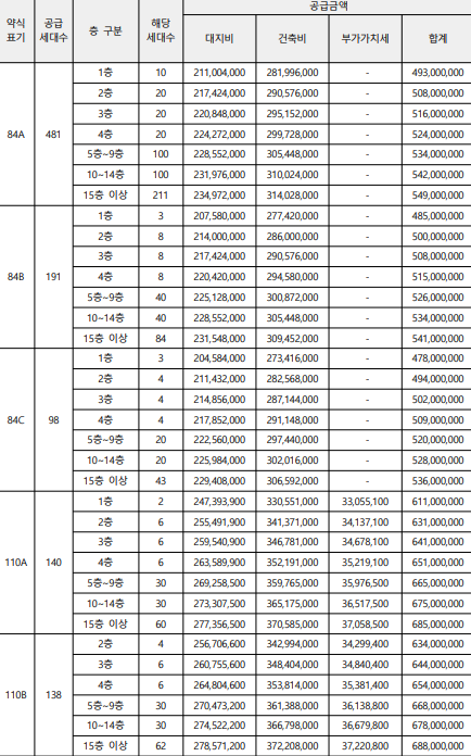최저가 84㎡ 타입의 4억7천8백만 원부터 최고가 110㎡타입의 6억8천8백만 원까지 형성되어 있습니다. 발코니 확장비는 타입별 8,620,000원부터 10,680,000원까지 상이합니다. 계약금은 10%이며 1차, 2차로 나눠서 납부합니다. 1차 : 1천만원 납부, 계약일로부터 30일 이내 2차 : 분양가의 10% - 1천만원 납부예정입니다.