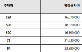 최저가 39㎡ 타입의 1억8천1백만 원부터 최고가 84㎡타입의 5억 8천9백만 원까지 형성되어 있습니다. 발코니 확장비는 타입별 16,190,000원부터 23,380,000원까지 상이합니다. 계약금은 10%이며 1차, 2차로 나눠서 납부합니다. 1차 계약금 1000만 원 납부, 1개월 이내에 2차 계약금 분양가의 10% - 1000만 원 납부예정입니다.