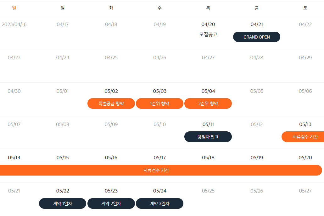 특별공급은 2023년 5월 2일이며, 1순위 청약일은 2023년 5월 3일입니다. 당첨자 발표일은 2023년 5월 11일이며, 계약일은 2023년 5월 22일부터 5월 24일까지 3일간 진행됩니다.