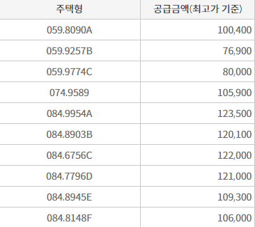 최저가 59㎡ 타입의 6억1천1백만 원부터 최고가 84㎡타입의 12억3천5백만 원까지 형성되어 있습니다. 계약금은 10%이며, 중도금은 1회차 30%(2023년8월10일), 2회차 30% (2023년11월10일), 입주 시 30% 잔금 납부 예정입니다.